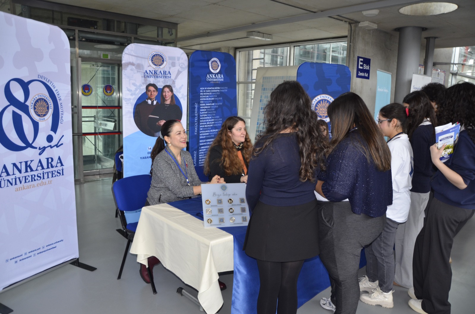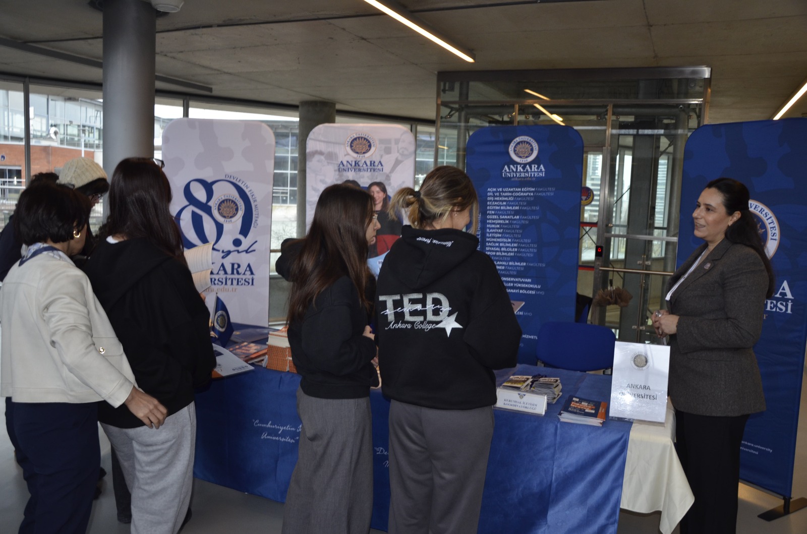 TED Ankara Kolejinin ev sahipliğinde gerçekleştirilen Üniversite Tanıtım Fuarına katılan Ankara Üniversitesi Kurumsal İletişim Koordinatörlüğü, üniversite adayı öğrencilerle bir araya geldi. Koordinatörlüğümüz yetkilileri tarafından yapılan bilgilendirmelerde, Ankara Üniversitesinin köklü akademik geçmişi, araştırma odaklı eğitim anlayışı ve öğrencilere sunduğu ulusal ve uluslararası imkanlar hakkında detaylı bilgiler paylaşıldı.