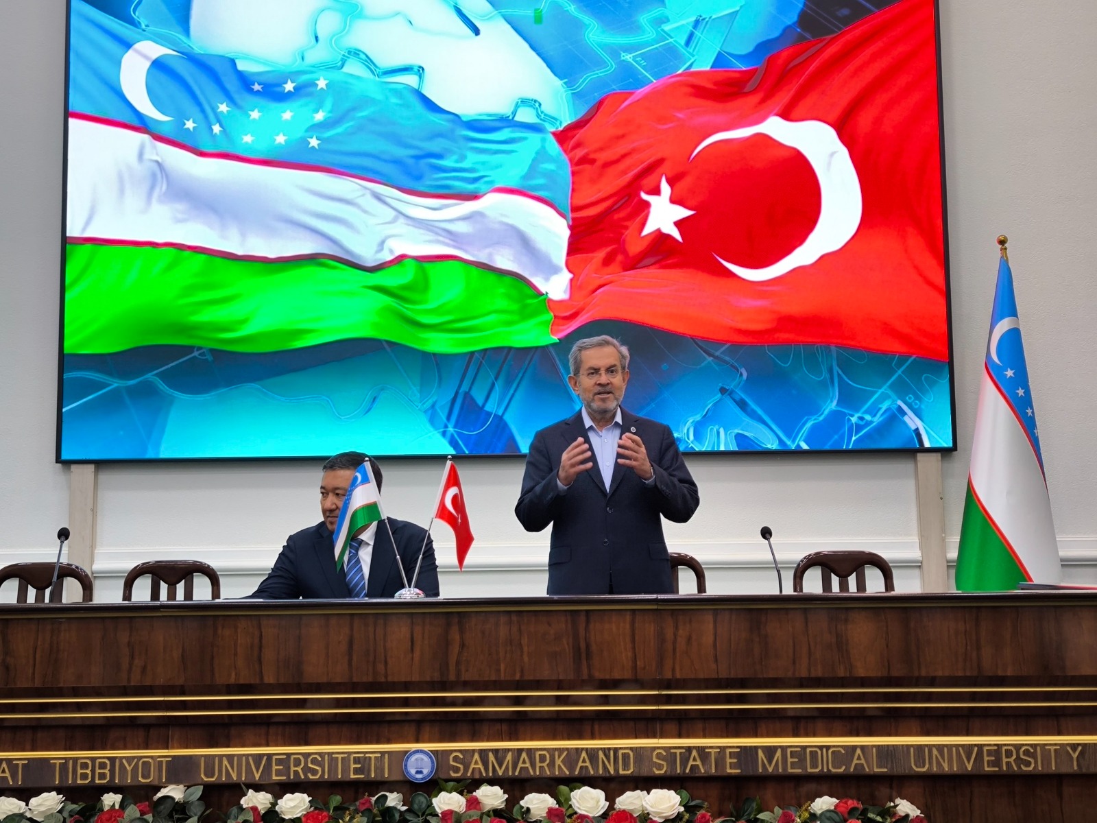 Semerkant Devlet Tıp Üniversitesi Rektörü Prof. Dr. Jasur Rizaev de Türkiye’nin en önemli üniversitelerinden Ankara Üniversitesinin rektörünü ve rektör yardımcılarını üniversitelerinde ağırlamaktan çok büyük memnuniyet duyduğunu dile getirdi.